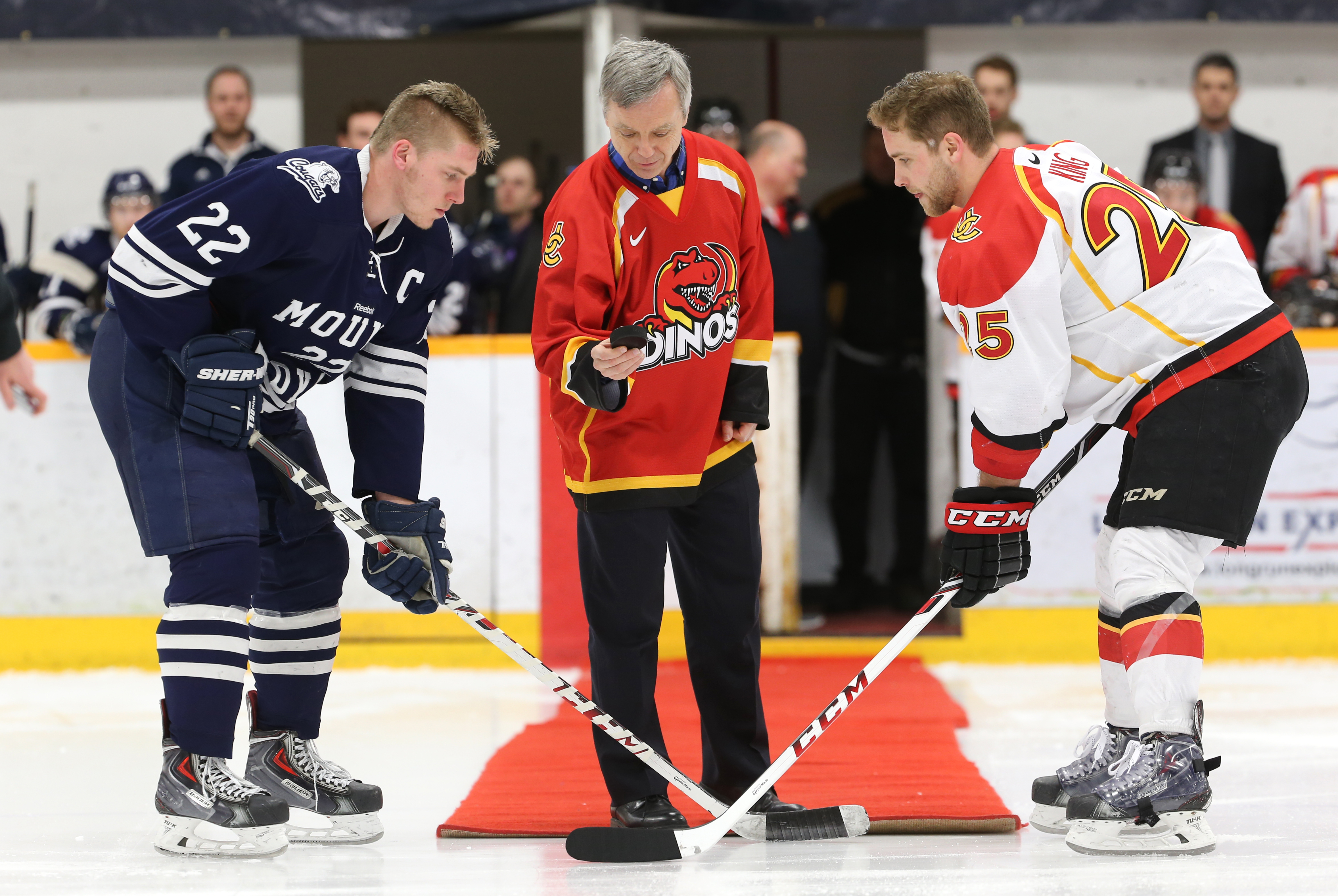 The University of Calgary Dinos men’s hockey team won their playoff game today over our city rivals, the Mount Royal Cougars. It was the third and deciding game of their best-of-three series in the Canada West semi-finals (the Dinos had won the first game 3-2 while the Cougars won the second 5-2).